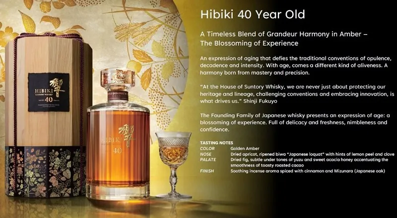 Kết hợp các loại whisky từ các nhà máy chưng cất Yamazaki, Hakushu và Chita, Hibiki 40 Years Old là loại Blended whisky lâu đời nhất đến từ thương hiệu này.
