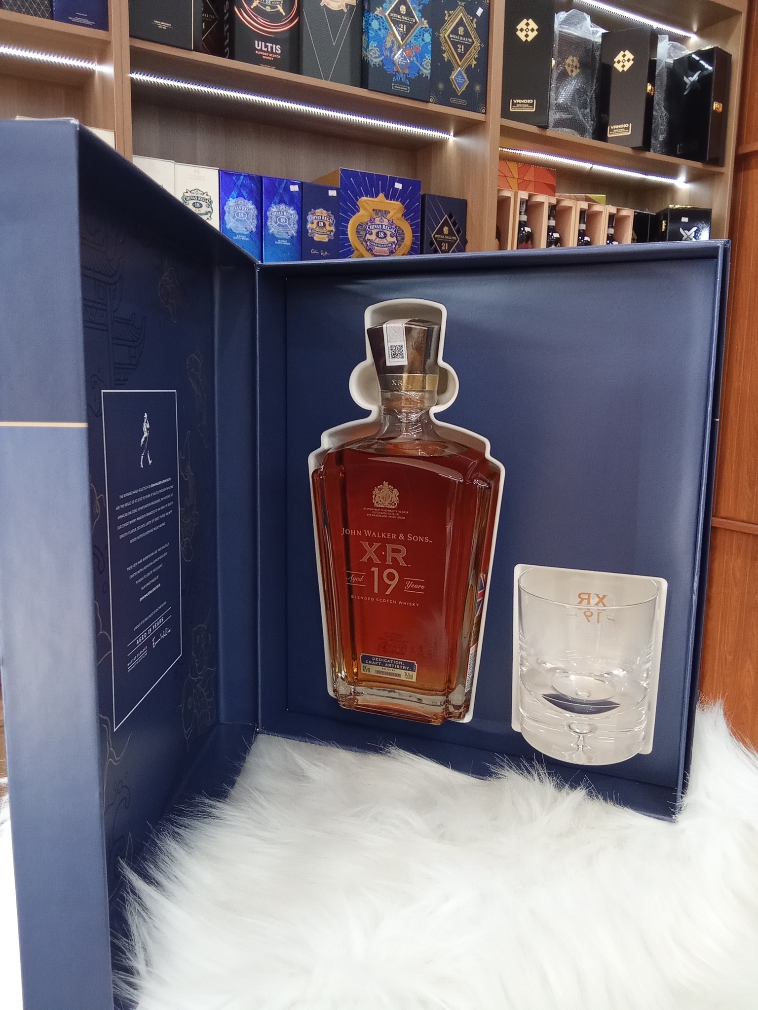 Chai Johnnie Walker XR: Bên trong hộp, bạn sẽ tìm thấy chai Johnnie Walker XR 19 Năm, một biểu tượng của sự chọn lựa tỉ mỉ và thời gian. Với 19 năm ủ trong các thùng gỗ sồi chất lượng cao, chai XR mang đến một hương vị tinh tế và độc đáo, vượt qua thời gian để đem đến những khoảnh khắc thượng hạng.