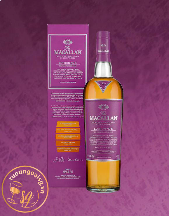 Macallan Edition No. 5 là sự kết hợp giữa kỹ thuật sản xuất whisky bậc thầy cùng chuyên môn và hiểu biết về màu sắc, loại rượu Singlemalt này tôn vinh cả sự trung thành với màu sắc tự nhiên của Macallan cũng như sự phức tạp của quá trình làm whisky.