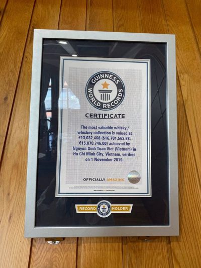 Giờ đây, một cư dân thành phố Hồ Chí Minh đã được công nhận là Kỷ lục Guinness Thế giới về bộ sưu tập rượu whisky giá trị nhất thế giới. Mặc dù anh ấy sở hữu ‘chỉ’ 535 chai (có một vài bộ sưu tập lên đến hàng nghìn chai), nhưng nhiều chai là hiếm nhất và đắt nhất thế giới. Bộ sưu tập được định giá ước tính khoảng 10.770.635 bảng Anh (13,9 triệu USD). Tuy nhiên, nếu bao gồm cả khoản phí bảo hiểm của người mua là 21% nếu bộ sưu tập được bán thông qua một công ty đấu giá của Vương quốc Anh như Sotheby’s, thì giá trị sẽ tăng lên 13 triệu bảng Anh (16,75 triệu đô la) và đó là con số được Guinness liệt kê.