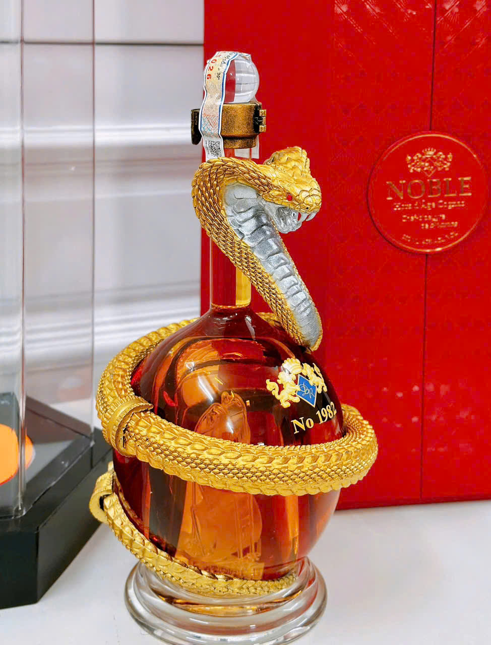 Chai rượu Cogac màu vàng hổ phác được con rắn ôm quanh, tạo thế và dáng đẹp độc nhất vô nhị