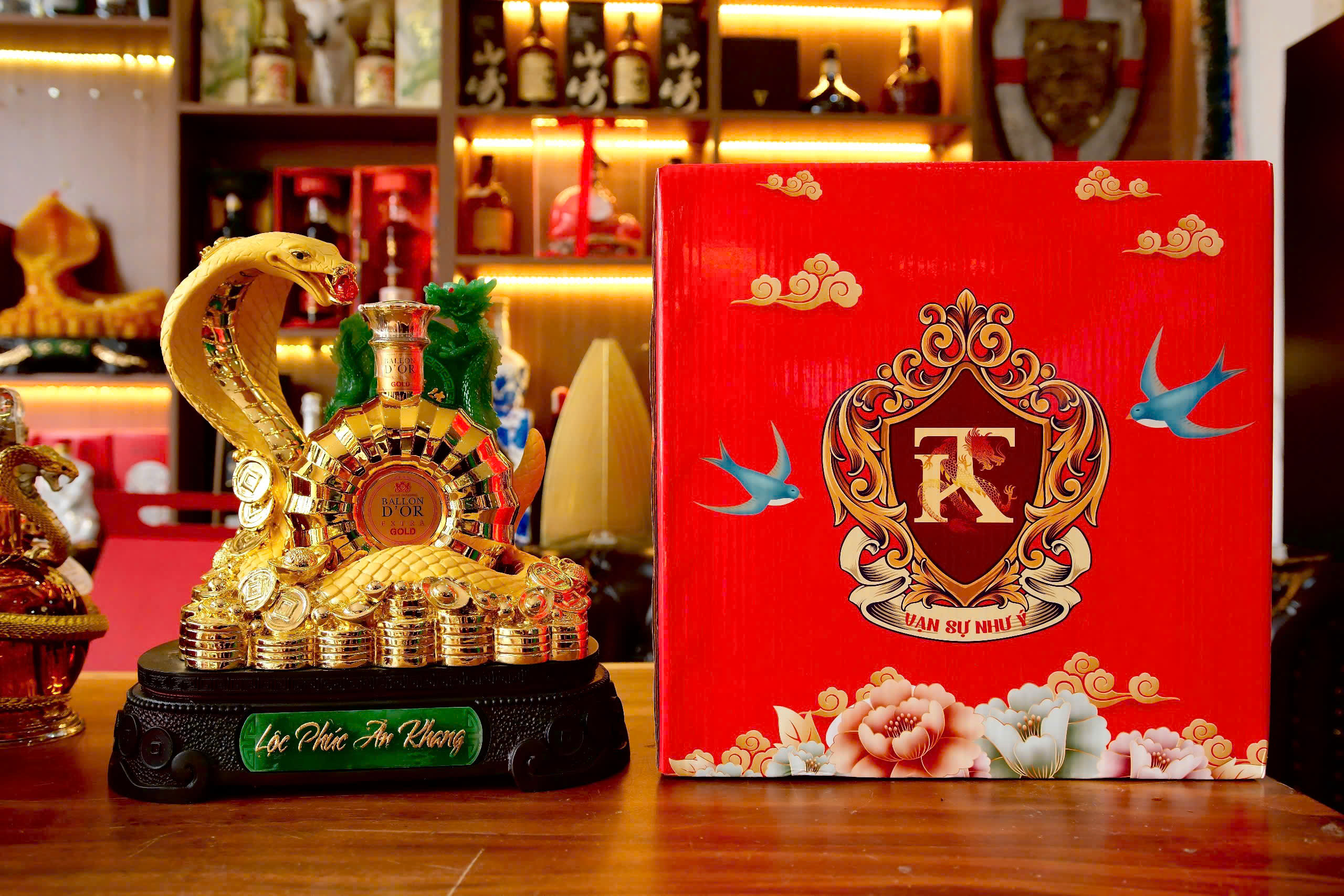 Rượu rắn vàng Lộc Phát đầy lộng lẫy với tượng rắn uy nghi cùng chai rượu XO sang trọng. Tất cả tạo nên quà rượu tặng tết sang trọng gửi tặng nhau cho năm mới 2025 Ất Tỵ thật nhiều sung túc.