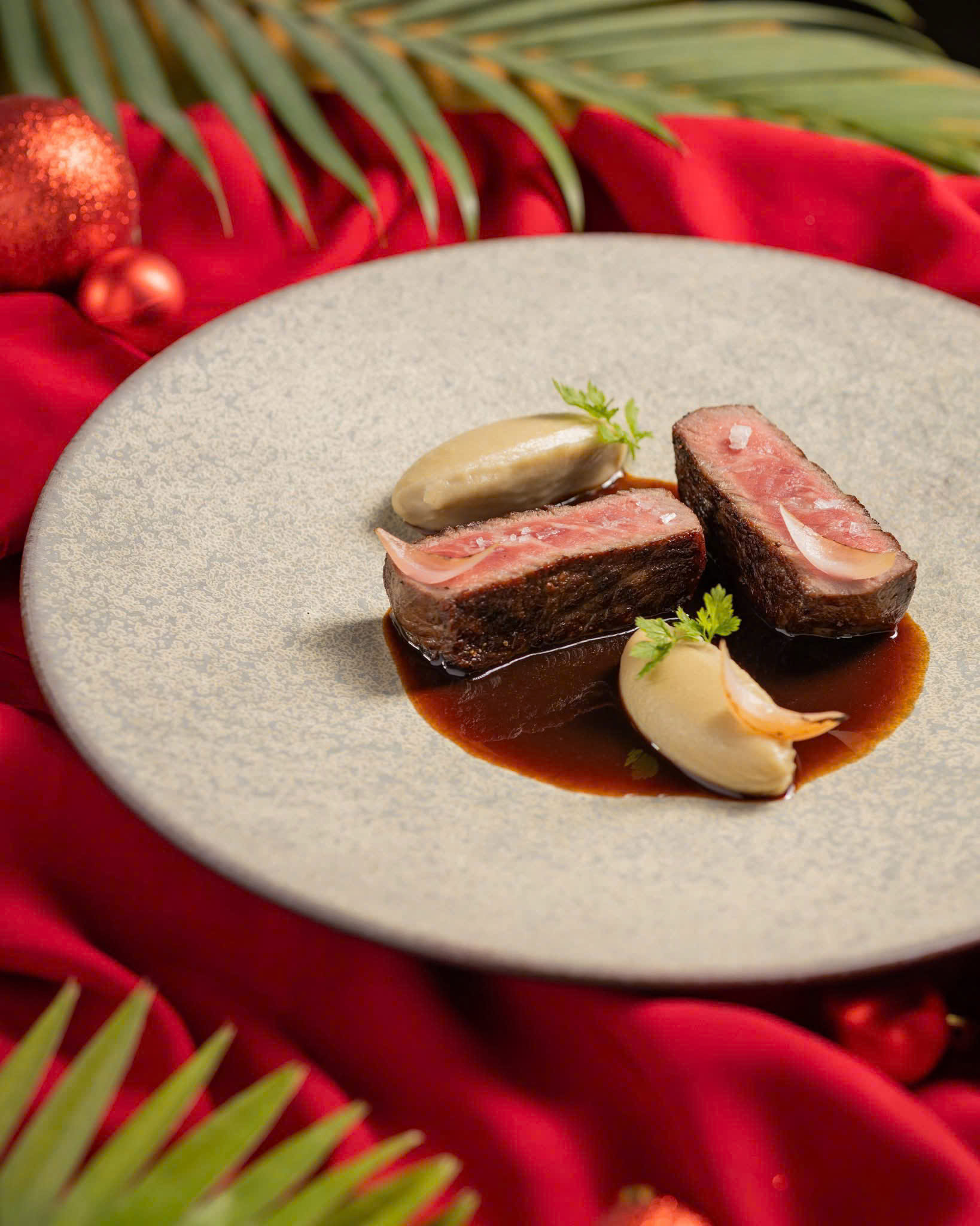 Beef Short Ribs with Red Wine Sauce – Sườn bò hầm mềm, thấm đẫm sốt vang đỏ thơm nồng.