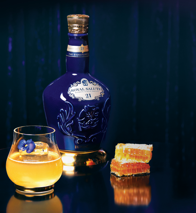 Đỉnh cao của Royal Salute là hương thơm từ gỗ cây tuyết tùng và hương hạnh nhân nghiền đặc trưng , với hương thơm đến từ các thùng gỗ sồi đựng Sherry lâu năm. Royal Salute 38Y° với vẻ ngoài thủ công tinh xảo, giống như đá granite, với cổ bình sứ nạm vàng 24-carat gợi nhớ đến chuôi của thanh gươm cổ Scotland. Mỗi bình sứ được bọc một cách xinh xắn trong một hộp nhung đỏ tao nhã với phần đáy màu đen sáng bóng . Đây cũng là whisky đầu tiên với thiết kế ổ khóa trên hộp, nắp mở ra từ phía trên chuyển tải hình ảnh sang trọng, quý phái hơn.